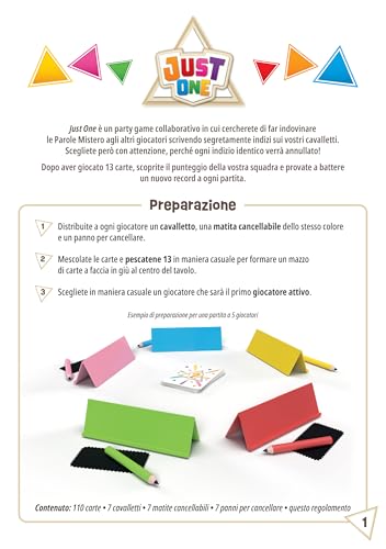 Just One è un entusiasmante party game cooperativo che mette alla prova la creatività e l'originalità dei giocatori. In questo gioco, uno dei partecipanti deve indovinare una parola misteriosa attraverso indizi forniti dagli altri, il tutto in un'atmosfera di divertimento e collaborazione.