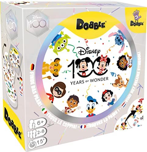 “Dobble Disney Anniversary: 100 Years of Wonder” by Asmodee is a special edition of the beloved observation-and-speed game, created to honor Disney’s 100th anniversary. This edition pays tribute to Disney’s iconic characters and symbols—making it perfect for fans of all ages.