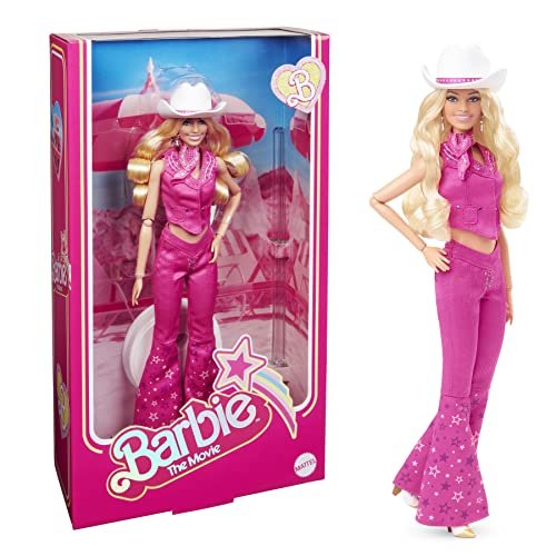 Barbie celebrates the Barbie movie with a collectible doll featuring an eye-catching western look, complete with a matching vest and V-shaped flared jeans. Her pink denim ensemble boasts luxurious details, including contrast stitching, intricate embroidery, silver buttons, and star-shaped embellishments. Her adorable cream-and-gold cowboy boots are the very same ones worn by Margot Robbie’s Barbie in the film! Additional accessories include a cowboy hat and a star-print bandana. With her all-pink outfit, Barbie’s western style is pure fun! Includes a collectible Barbie movie packaging. Discover the full collection for more fantastic gift ideas! Each item sold separately, while supplies last.