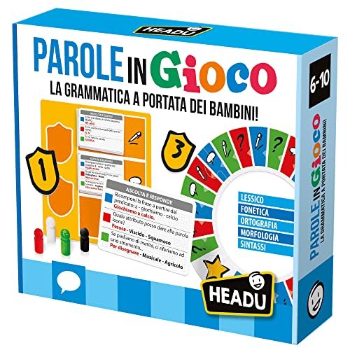Discover grammar through play? Yes—with Headu – Words in Play, the Educational Game for Children Aged 6–12 that turns learning into a celebration! With this game, young word explorers will gain the power to understand and categorize vocabulary, embrace the first rules of syntax, and construct sentences with phonetics and spelling—all while having a blast! Featuring a round puzzle board, 3 decks of cards, 10 rosettes, 4 whiteboards with erasable markers, 4 placeholder pins, a question board, and simple rules, it’s the perfect kit for family fun.