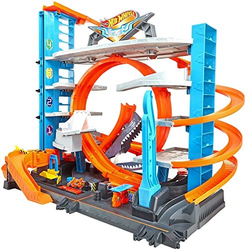 Discover the thrilling “Hot Wheels City Stunt Garage.” With space for over 100 die-cast cars, a working elevator, a hungry shark, and a robotic T-Rex, this set delivers heart-pounding adventures. Connect it to Hot Wheels ID for digital challenges and expand your Hot Wheels City by linking it with other sets.
