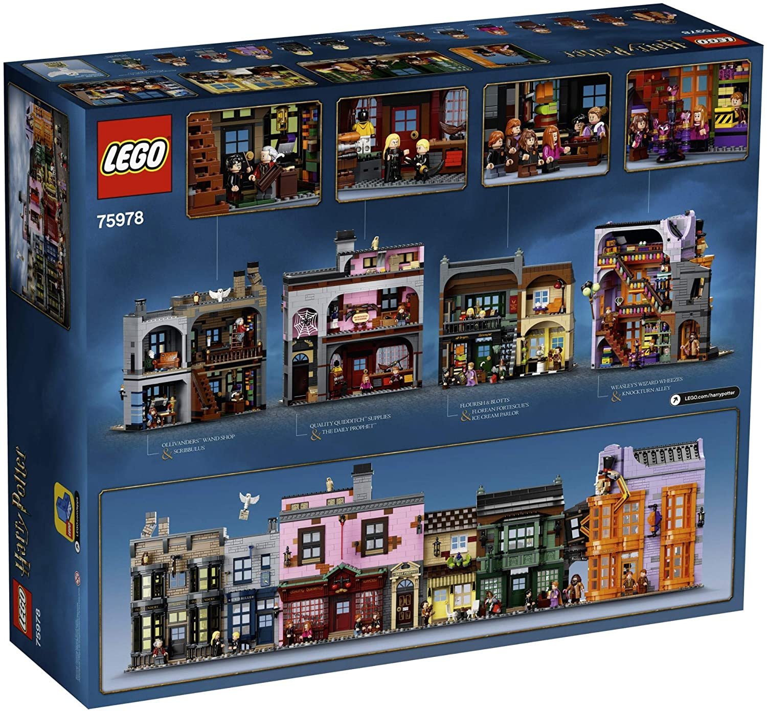 LEGO Harry Potter Diagon Alley (75978) is a stunning recreation of London’s most magical shopping street—perfect for fans of the Harry Potter films, ages 16 and up. This set features iconic shops brimming with authentic movie details. Measuring over three feet wide, the impressive model captures the grand scale and lively atmosphere of the bustling magical marketplace. Behind the magnificent façades lie detailed interiors, fun interactive features, and beloved characters. Visit Ollivander’s wand shop; stop by Gilderoy Lockhart’s book signing at The Leaky Cauldron bookstore; pick up a love potion at Weasleys’ Wizard Wheezes; browse stationery and supplies at Scribbulus; check out top-quality Quidditch gear at Quality Quidditch Supplies; treat yourself to ice cream at Florean Fortescue’s Ice Cream Parlour; and grab the latest edition of The Daily Prophet. The set includes four exclusive new minifigures: Gilderoy Lockhart, Florean Fortescue, Lucius Malfoy, and a Daily Prophet photographer.